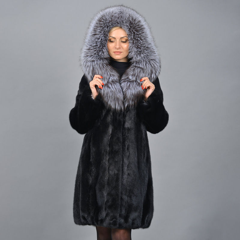 Mink Coat Fur Winter Women Real Mink Fur Long Coat Real Silver Fox With Hooded
