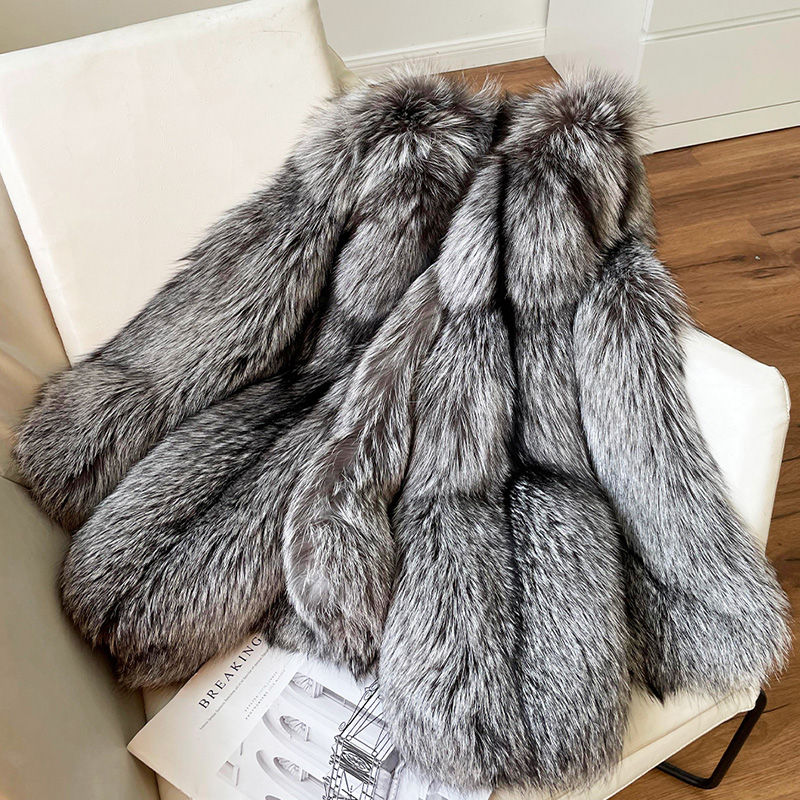 Real Natural Silver Fox Fur Coat Highend Quality Genuine Women Winter Luxury